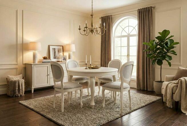 Stół okrągły, kolekcja Orchidea wykonany z okleiny dębowej + 4 krzesła (takie jak na zdjęciu) Wymiary: ...